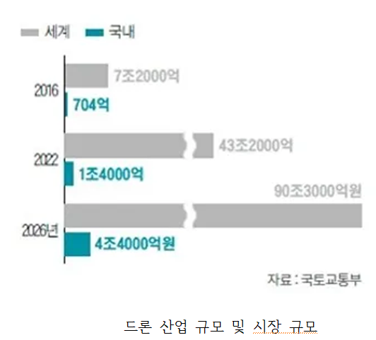 ¿µÈ, µå¶ó¸¶ µî¿¡¼ µå·ÐÀÌ ÀÚÁÖ µîÀåÇϰí DJI ÆÒÅÒ µî°ú °°ÀÌ º¸±ÞÇü ¸ðµ¨ÀÌ º¸±ÞµÇ¸é¼ Ä£¼÷ÇØÁ³Áö¸¸, ±º»ç¿ëÀ» Á¦¿ÜÇÏ¸é ½ÃÀå±Ô¸ð´Â ¾ÆÁ÷Àº ¸Å¿ì ÀÛÀº ÆíÀÌ´Ù. ±×·¯³ª ¼¼°è µå·Ð ½ÃÀåÀÇ ±Ô¸ð´Â ³ª³¯ÀÌ Ä¿Áö°í ÀÖ´Ù. ±¹Åä±³ÅëºÎ¿¡ µû¸£¸é Àü ¼¼°è µå·Ð ½ÃÀå ±Ô¸ð°¡ 2016³â 7Á¶2000¾ï¿ø¿¡¼ 2022³â 43Á¶2000¾ï¿ø¿¡ À̾î 2026³â 90Á¶3000¾ï¿ø±îÁö ¼ºÀåÇÒ Àü¸ÁÀÌ´Ù. Çѱ¹ µå·Ð ½ÃÀå ¿ª½Ã ºü¸£°Ô ¼ºÀåÇϰí ÀÖ´Ù. ±¹ÅäºÎ¿¡ µû¸£¸é, 2013³â 193´ë¿¡ ºÒ°úÇß´ø Á¤ºÎ¿¡ ½Å°íµÈ µå·Ð ±âü ¼ö´Â 2019³â 9,342´ë·Î 40¹è ÀÌ»ó Áõ°¡Çß´Ù. µå·Ð ¾÷ü´Â 2013³â¿¡ 131°÷¿¡ ºÒ°úÇßÀ¸³ª 2019³â 2,500°÷À» ³Ñ°åÀ¸¸ç, °°Àº ±â°£¿¡ 50¸í´ë¿´´ø µå·Ð Á¶Á¾ ÀÚ°Ý ÃëµæÀÚ ¼ö´Â Áö³ÇØ 2¸¸ ¸íÀ» ³Ñ°å´Ù. ´ëÅë·É Á÷¼Ó 4Â÷»ê¾÷Çõ¸íÀ§¿øÈ¸¿¡ µû¸£¸é ÇâÈÄ 10³â°£ µå·Ð »ê¾÷Àº 17¸¸ ¸í ±Ô¸ðÀÇ °í¿ëÀ» âÃâÇϰí, 29Á¶¿ø¿¡ ´ÞÇÏ´Â ºÎ°¡ °¡Ä¡¸¦ »ý»êÇÒ °ÍÀ¸·Î ¿¹»óµÈ´Ù.