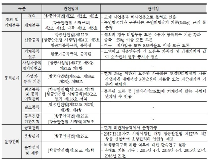 µî·Ï °ü¸®ÀÇ °æ¿ì, Ç×°ø¾ÈÀü¹ý Á¦122Á¶ ¹× ½ÃÇà·É Á¦24Á¶ Á¦5È£¿¡ µû¶ó ½Å±Ô µî·Ï ½Ã Ç×°ø±â µî·Ï±ÔÄ¢, µî·Ï·É¿¡ µû¶ó 12kg ÀÌ»óÀÇ µå·ÐÀ» ´ë»óÀ¸·Î µî·Ï ó¸®Çϵµ·Ï Çϰí ÀÖÀ¸³ª ¹Ì±¹, ÀϺ», Áß±¹ µîÀº 200g~250g ÀÌ»óÀÇ µå·Ð¿¡ ´ëÇØ¼ ¼ÒÀ¯ÀÚ´Â µî·ÏÀǹ«¸¦ °®°í ÀÖ¾î À§Ç輺 °ü¸®ÀÇ Â÷¿ø¿¡¼ ¿ì¸®³ª¶óµµ 200g ÀÌ»óÀÇ µå·Ð¿¡ ´ëÇÏ¿© µî·ÏÀǹ«¸¦ °³¼±ÇÒ Çʿ䰡 ÀÖ´Ù.